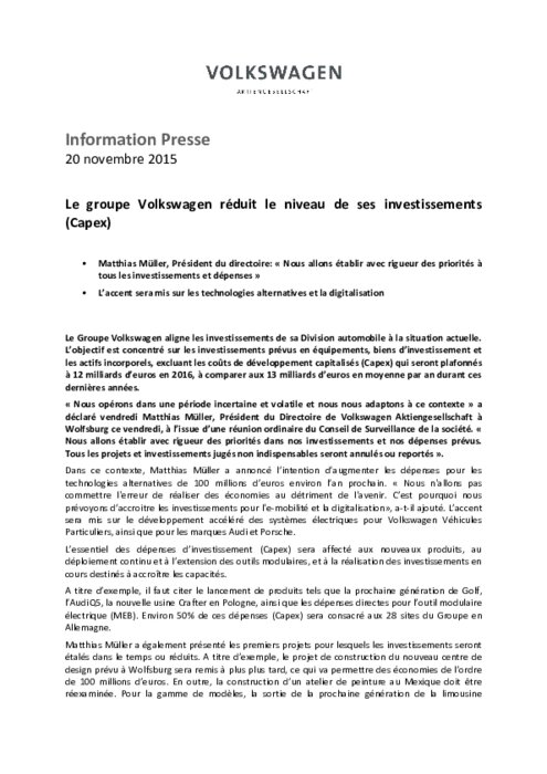 Le Groupe Volkswagen aligne les investissements de sa Division automobile à la situation actuelle. L’objectif est concentré sur les investissements prévus en équipements, biens d’investissement et les actifs incorporels, excluant les coûts de développement capitalisés (Capex) qui seront plafonnés à 12 milliards d’euros en 2016, à comparer aux 13 milliards d’euros en moyenne par an durant ces dernières années.