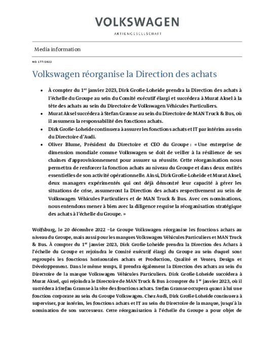 Le Groupe Volkswagen réorganise les fonctions achats au niveau du Groupe, mais aussi pour les marques Volkswagen Véhicules Particuliers et MAN Truck & Bus. À compter du 1er janvier 2023, Dirk Große-Loheide prendra la Direction des Achats à l’échelle du Groupe et rejoindra le Comité exécutif élargi du Groupe au sein duquel sont regroupés les fonctions horizontales achats et Production, Qualité et Ventes, Design et Développement.