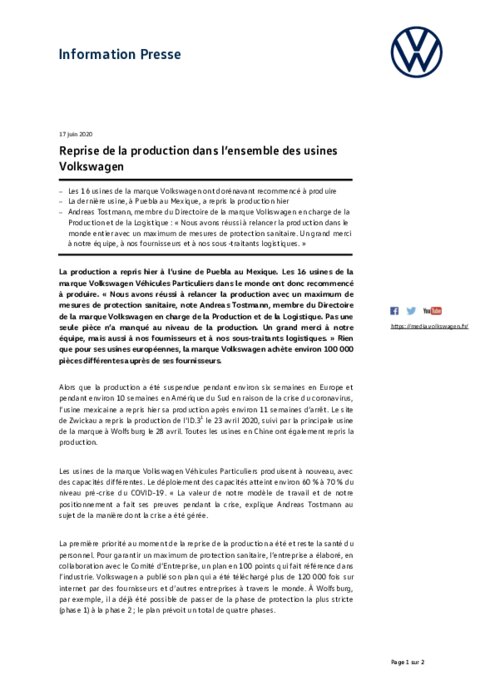 La production a repris hier à l’usine de Puebla au Mexique. Les 16 usines de la marque Volkswagen Véhicules Particuliers dans le monde ont donc recommencé à produire. « Nous avons réussi à relancer la production avec un maximum de mesures de protection sanitaire, note Andreas Tostmann, membre du Directoire de la marque Volkswagen en charge de la Production et de la Logistique. Pas une seule pièce n’a manqué au niveau de la production. Un grand merci à notre équipe, mais aussi à nos fournisseurs.