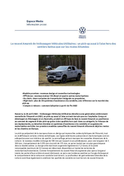 Volkswagen Véhicules Utilitaires dévoilera une génération entièrement nouvelle de l’Amarok en 2022, un pick-up aussi à l’aise en tout-terrain que sur l’asphalte. Conçu et développé en Allemagne et en Australie, produit en Afrique du Sud, le nouvel Amarok se positionne au sommet du segment B des pick-up grâce à des qualités hors pair dans sa catégorie, la richesse de ses équipements, sa dotation étendue en systèmes d’assistance à la conduite et sa gamme de motorisation enrichie.