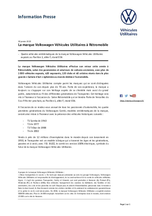 La marque Volkswagen Véhicules Utilitaires effectue son retour cette année à Rétromobile, salon des passionnées et amateurs de voitures anciennes, avec plus de 1 000 véhicules exposés, 620 exposants, 120 clubs et 60 artistes réunis dans la plus grande "Galerie d’Art" éphémère au monde dédiée à l’automobile.