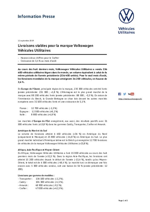 Au cours des huit derniers mois, Volkswagen Véhicules Utilitaires a vendu 336 600 véhicules utilitaires légers dans le monde, un volume équivalent à celui de la même période de l’année précédente (336 400 unités). Pour le seul mois d’août, les livraisons mondiales de la marque atteignent 36 200 véhicules, en hausse de 3,4 %.