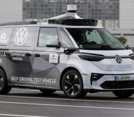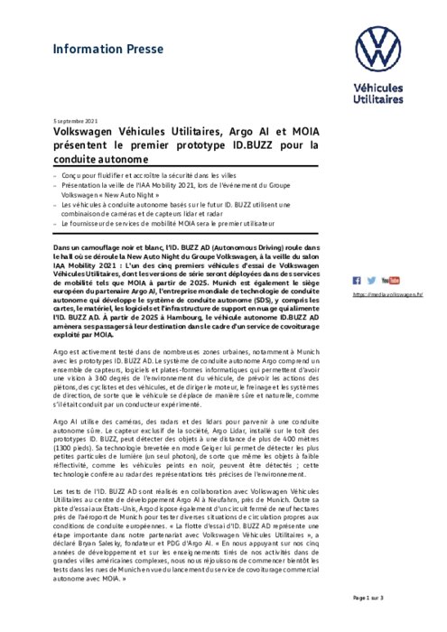 Dans un camouflage noir et blanc, l’ID. BUZZ AD (Autonomous Driving) roule dans le hall où se déroule la New Auto Night du Groupe Volkswagen, à la veille du salon IAA Mobility 2021 : L'un des cinq premiers véhicules d'essai de Volkswagen Véhicules Utilitaires, dont les versions de série seront déployées dans des services de mobilité tels que MOIA à partir de 2025...