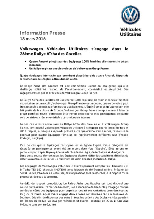 Quatre Amarok pilotés par des équipages 100% féminins sillonneront le désert marocain. Un Rallye en phase avec les valeurs de Volkswagen Group France. Quatre équipages internationaux prendront place à bord de quatre Amarok. Départ de