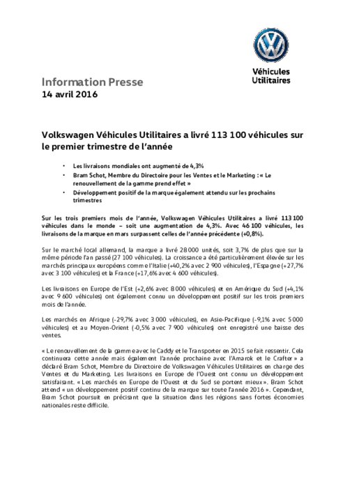 Sur les trois premiers mois de l’année, Volkswagen Véhicules Utilitaires a livré 113 100 véhicules dans le monde – soit une augmentation de 4,3%. Avec 46 100 véhicules, les livraisons de la marque en mars surpassent celles de l’année précédente (+0,8%).