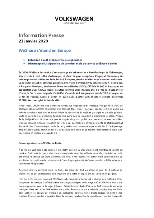 En 2020, WeShare, le service d'auto-partage de véhicules en " free-floating " de Volkswagen, sera étendu à sept villes d'Allemagne et d'autres pays européens. Prague et Hambourg au printemps seront suivies par Paris, Madrid, Budapest, Munich et Milan dans le courant de l'année. Dans toutes ces villes, WeShare proposera une flotte d'environ 8 400 véhicules 100 % électriques. À Prague et Budapest, WeShare utilisera des véhicules SKODA CITIGOe iV 100 % électriques en coopération avec SKODA...