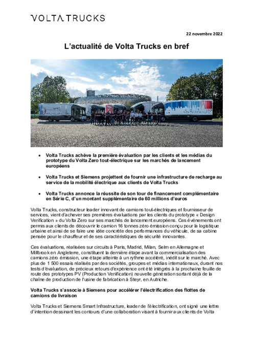 Volta Trucks, constructeur leader innovant de camions tout-électriques et fournisseur de services, vient d’achever ses premières évaluations par les clients du prototype « Design Verification » du Volta Zero sur ses marchés de lancement européens. Ces événements ont permis aux clients de découvrir le camion 16 tonnes zéro émission conçu pour la logistique urbaine et ainsi de se faire une idée concrète des performances du véhicule, de sa cabine pensée pour le chauffeur.
