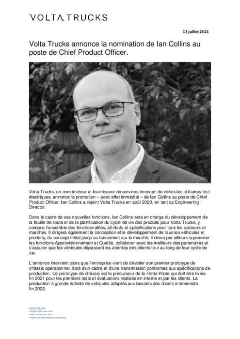 Volta Trucks, un constructeur et fournisseur de services innovant de véhicules utilitaires tout électriques, annonce la promotion - avec effet immédiat - de lan Collins au poste de Chief Product Officer. Ian Collins a rejoint Volta Trucks en août 2020, en tant qu’Engineering Director.