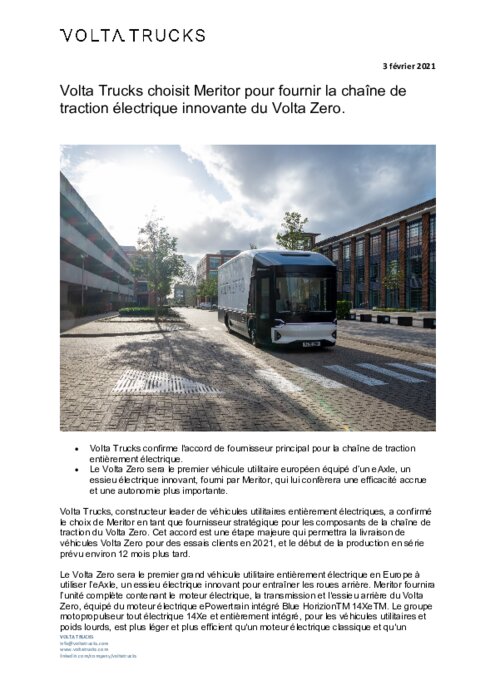 Volta Trucks, constructeur leader de véhicules utilitaires entièrement électriques, a confirmé le choix de Meritor en tant que fournisseur stratégique pour les composants de la chaîne de traction du Volta Zero. Cet accord est une étape majeure qui permettra la livraison de véhicules Volta Zero pour des essais clients en 2021, et le début de la production en série prévu environ 12 mois plus tard.