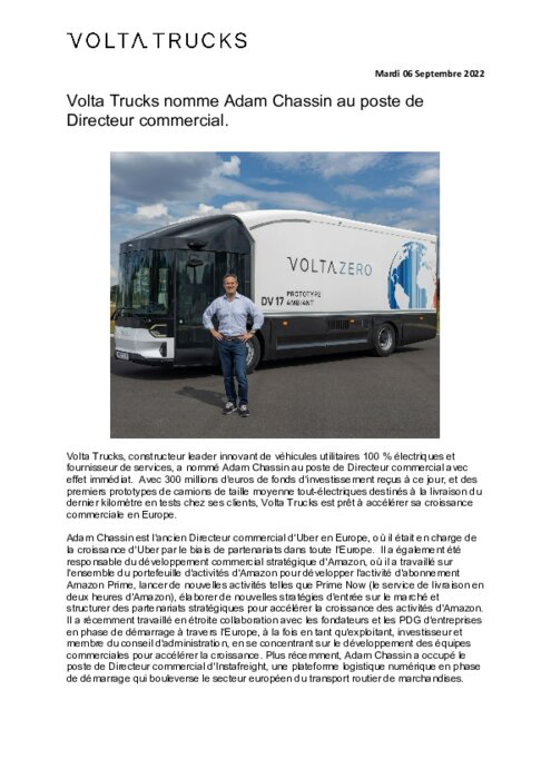 Volta Trucks, constructeur leader innovant de véhicules utilitaires 100 % électriques et fournisseur de services, a nommé Adam Chassin au poste de Directeur commercial avec effet immédiat. Avec 300 millions d'euros de fonds d'investissement reçus à ce jour, et des premiers prototypes de camions de taille moyenne tout-électriques destinés à la livraison du dernier kilomètre en tests chez ses clients, Volta Trucks est prêt à accélérer sa croissance commerciale en Europe.