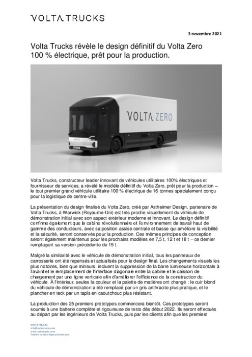 Volta Trucks, constructeur leader innovant de véhicules utilitaires 100% électriques et fournisseur de services, a révélé le modèle définitif du Volta Zero, prêt pour la production – le tout premier grand véhicule utilitaire 100 % électrique de 16 tonnes spécialement conçu pour la logistique de centre-ville...