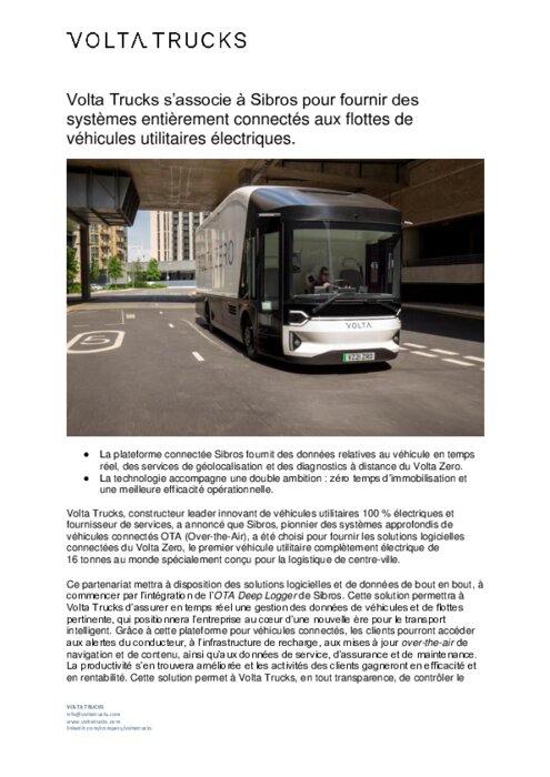 Volta Trucks, constructeur leader innovant de véhicules utilitaires 100 % électriques et fournisseur de services, a annoncé que Sibros, pionnier des systèmes approfondis de véhicules connectés OTA (Over-the-Air), a été choisi pour fournir les solutions logicielles connectées du Volta Zero, le premier véhicule utilitaire complètement électrique de 16 tonnes au monde spécialement conçu pour la logistique de centre-ville.