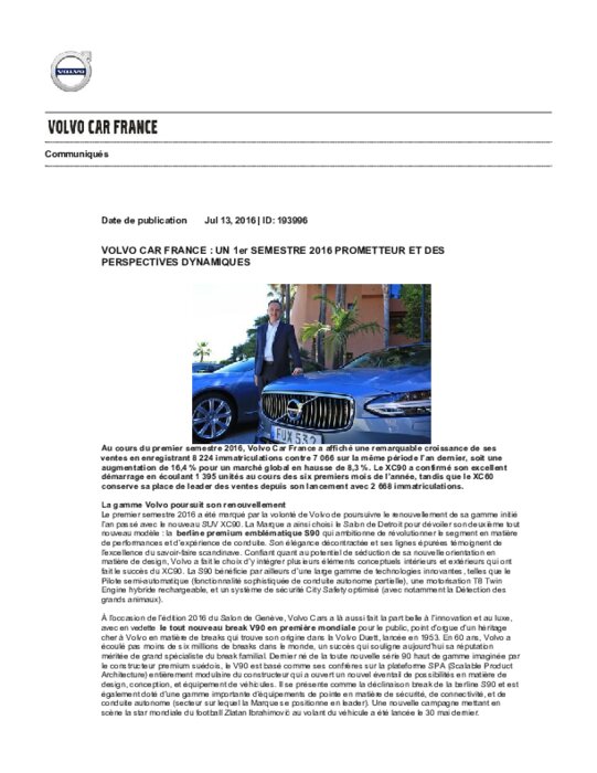 Au cours du premier semestre 2016, Volvo Car France a affiché une remarquable croissance de ses ventes en enregistrant 8 224 immatriculations contre 7 066 sur la même période l’an dernier, soit une augmentation de 16,4 % pour un marché global en hausse de 8,3 %. Le XC90 a confirmé son excellent démarrage en écoulant 1 395 unités au cours des six premiers mois de l’année, tandis que le XC60 conserve sa place de leader des ventes depuis son lancement avec 2 668 immatriculations.