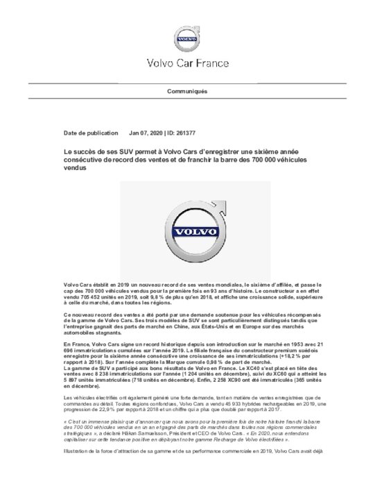 Volvo Cars établit en 2019 un nouveau record de ses ventes mondiales, le sixième d’affilée, et passe le cap des 700 000 véhicules vendus pour la première fois en 93 ans d’histoire. Le constructeur a en effet vendu 705 452 unités en 2019, soit 9,8 % de plus qu’en 2018, et affiche une croissance solide, supérieure à celle du marché, dans toutes les régions.