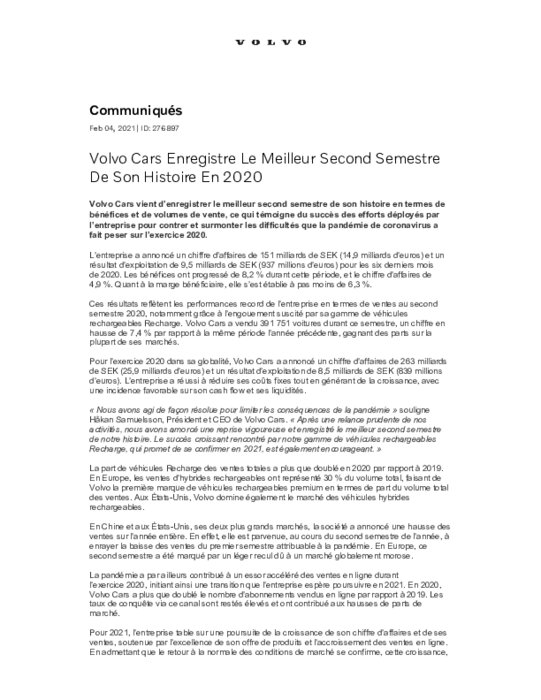 "Pour 2021, nous anticipons une poursuite de la croissance des ventes en volumes et en chiffre d'affaires", notamment grâce à la stratégie du constructeur dans l'électrique rechargeable, écrit le PDG Håkan Samuelsson.