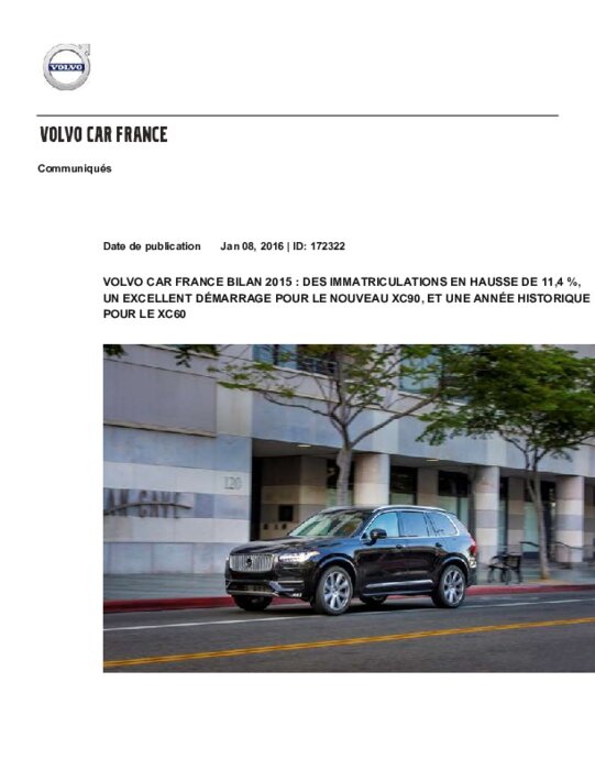 Avec un total de 13 876 immatriculations contre 12 459 en 2014, soit une hausse de 11,4 % sur un marché global à plus 6,8 %, Volvo Car France a affiché une remarquable progression en 2015. La Marque atteint désormais 8,1 % de part de marché sur son segment premium au sein de l’Hexagone.