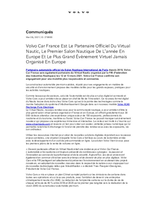 Partenaire automobile officiel du Salon Nautique International de Paris depuis 2018, Volvo Car France sera également partenaire du Virtual Nautic organisé par la FIN (Fédération des Industries Nautiques) les 12 et 13 mars 2021. Volvo Car France confirme son engagement pour une mobilité plus responsable et connectée.