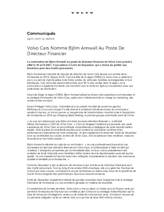 Constructeurs 08 avril 2021 - 14:12 La nomination de Björn Annwall au poste de directeur financier de Volvo Cars prendra effet le 19 avril 2021. Il succèdera à Carla de Geyseleer, qui a choisi de quitter ses fonctions pour des motifs personnels. PDF (168 Ko) Télécharger