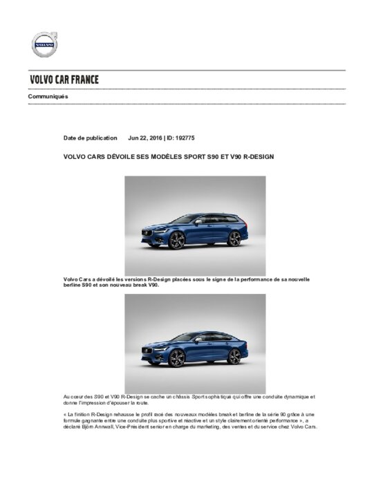 Volvo a dévoilé les versions RDesign placées sous le signe de la performance de sa nouvelle berline S90 et son nouveau break V90.Au cœur des S90 et V90 R Design se cache un châssis Sport sophistiqué qui offre une conduite dynamique et donne l’impression d’épouser la route. " La finition RDesign rehausse le profil racé des nouveaux modèles break et berline de la série 90 grâce à une formule gagnante entre une conduite plus sportive et réactive et un style clairement orienté performance ".