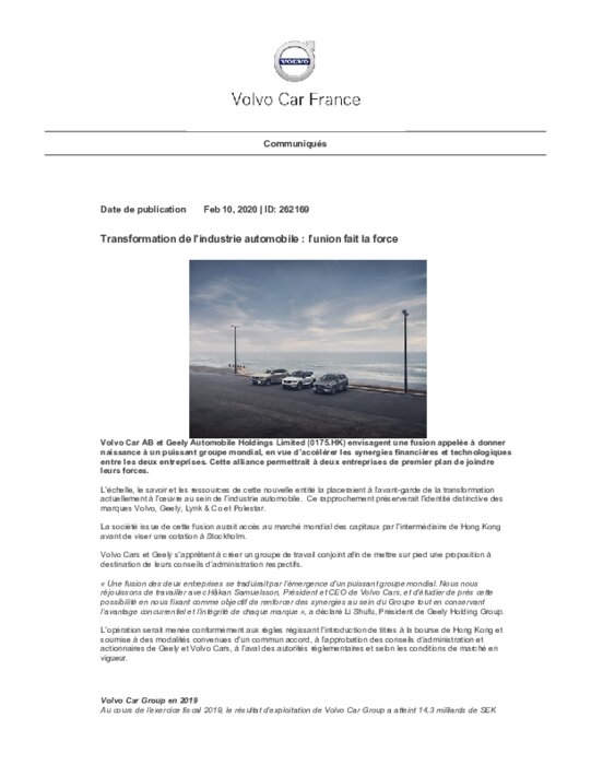 "Volvo Cars et Geely vont créer un groupe de travail pour préparer une proposition en ce sens à leurs conseils d'administration respectifs", ont précisé Volvo Cars et Geely Holdings.
