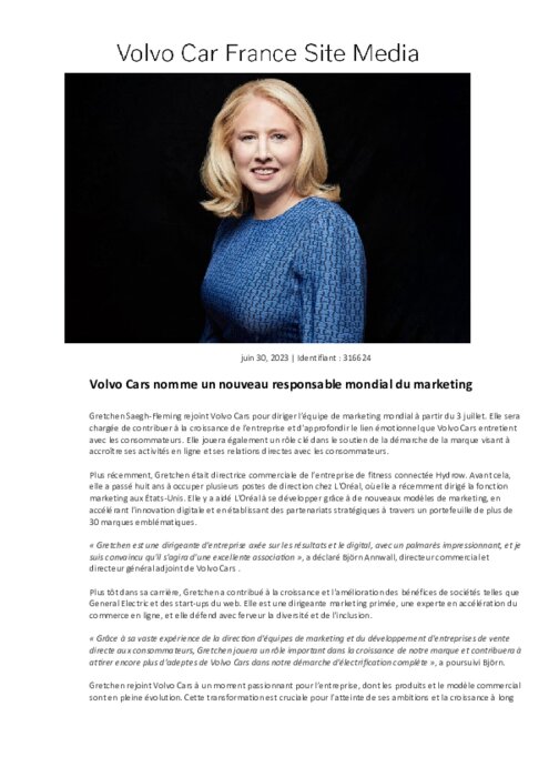 Gretchen Saegh-Fleming rejoint Volvo Cars pour diriger l’équipe de marketing mondial à partir du 3 juillet. Elle sera chargée de contribuer à la croissance de l’entreprise et d'approfondir le lien émotionnel que Volvo Cars entretient avec les consommateurs. Elle jouera également un rôle clé dans le soutien de la démarche de la marque visant à accroître ses activités en ligne et ses relations directes avec les consommateurs.