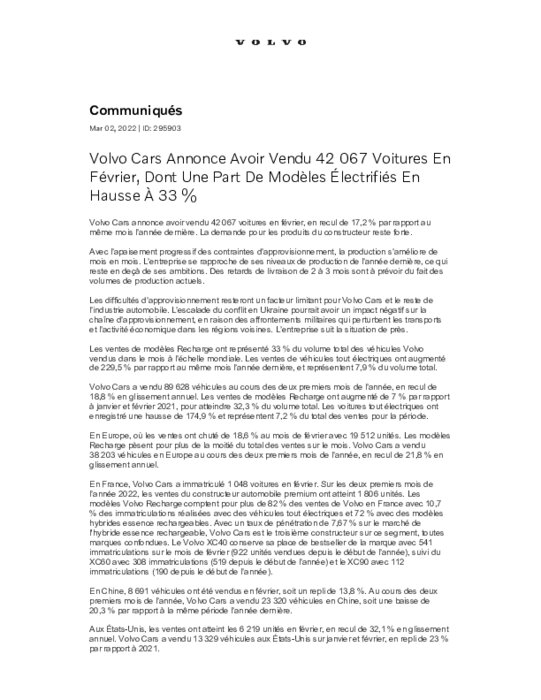 Volvo Cars annonce avoir vendu 42 067 voitures en février, en recul de 17,2 % par rapport au même mois l’année dernière. La demande pour les produits du constructeur reste forte. Avec l’apaisement progressif des contraintes d’approvisionnement, la production s’améliore de mois en mois. L’entreprise se rapproche de ses niveaux de production de l’année dernière, ce qui reste en deçà de ses ambitions. Des retards de livraison de 2 à 3 mois sont à prévoir du fait des volumes de production actuel...
