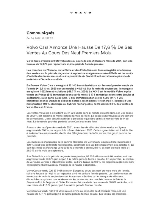 Volvo Cars a vendu 530 649 véhicules au cours des neuf premiers mois de 2021, soit une hausse de 17,6 % par rapport à la même période l'année passée. Les marchés de l’Europe, de la Chine et des États-Unis ont tous enregistré une hausse des ventes sur la période de janvier à septembre malgré une année difficile où les arrêts d'activité des fournisseurs dus à la pandémie de Covid-19 ont entraîné une pénurie de matériels à l’échelle mondiale.