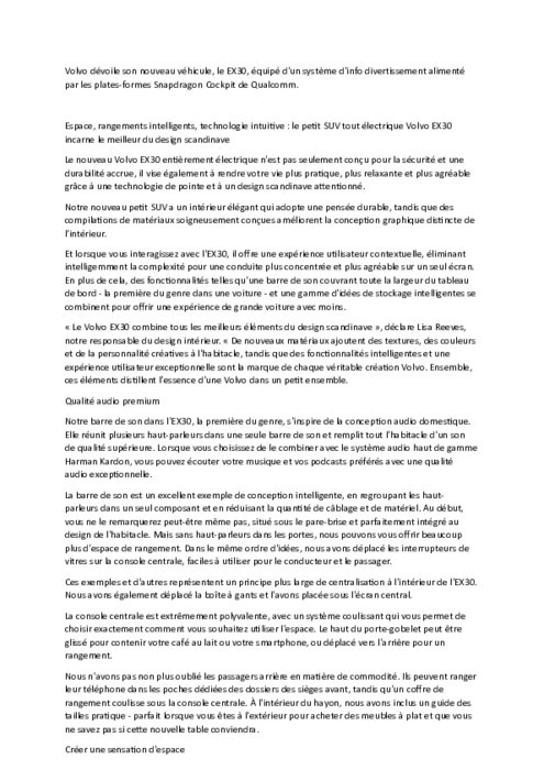 Espace, rangements intelligents, technologie intuitive : le petit SUV tout électrique Volvo EX30 incarne le meilleur du design scandinave. Le nouveau Volvo EX30 entièrement électrique n'est pas seulement conçu pour la sécurité et une durabilité accrue, il vise également à rendre votre vie plus pratique, plus relaxante et plus agréable grâce à une technologie de pointe et à un design scandinave attentionné.