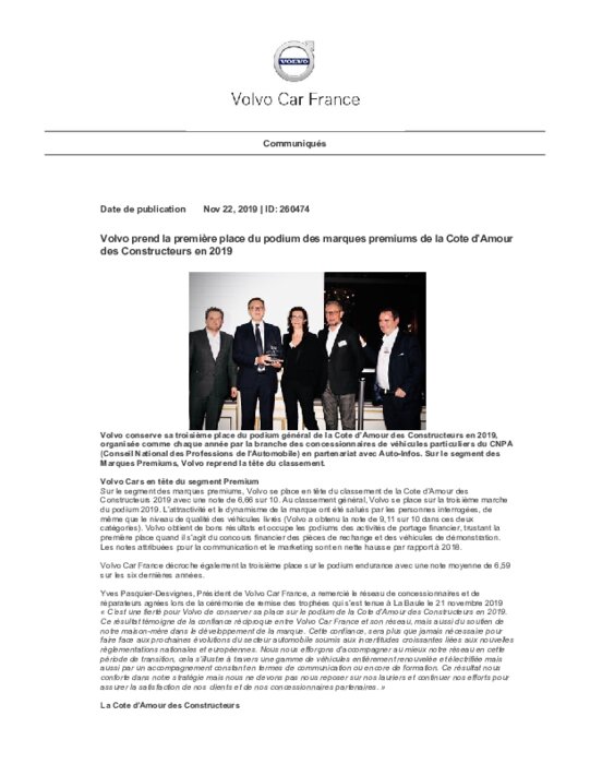Volvo conserve sa troisième place du podium général de la Cote d’Amour des Constructeurs en 2019, organisée comme chaque année par la branche des concessionnaires de véhicules particuliers du CNPA (Conseil National des Professions de l'Automobile) en partenariat avec Auto-Infos. Sur le segment des Marques Premiums, Volvo reprend la tête du classement.
