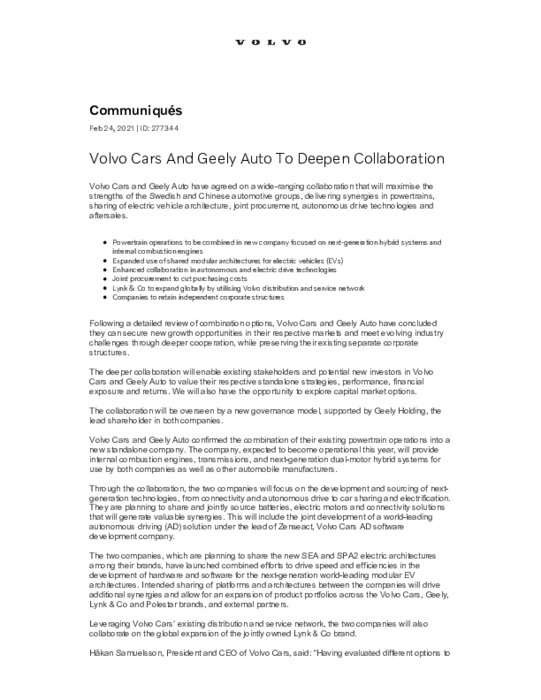 "Après avoir évalué différentes options (...), nous avons conclu conjointement qu'un modèle de collaboration entre deux entreprises indépendantes est le meilleur moyen de garantir une croissance continue et de réaliser en même temps des synergies technologiques dans de nombreux domaines", a déclaré le PDG de Volvo Cars Håkan Samuelsson, cité dans le communiqué.