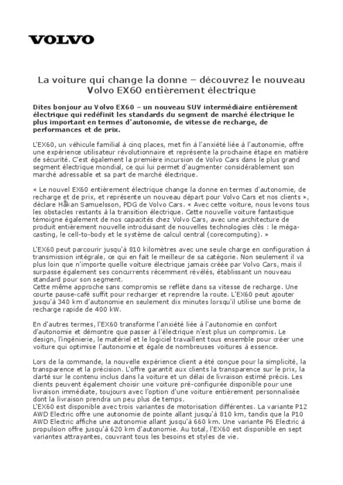 L'EX60, un véhicule familial à cinq places, met fin à l'anxiété liée à l'autonomie, offre une expérience utilisateur révolutionnaire et représente la prochaine étape en matière de sécurité. C'est également la première incursion de Volvo Cars dans le plus grand segment électrique mondial, ce qui lui permet d'augmenter considérablement son marché adressable et sa part de marché électrique.