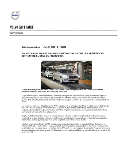 Le premier V90 prêt à être commercialisé n’est sorti des lignes de production que quelques semaines après le lancement en production de la berline premium S90. En d’autres termes, tous les nouveaux modèles haut de gamme de la série 90, basée sur la plate-forme SPA développée en interne par Volvo, sont désormais produits en Suède.