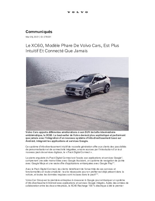 Volvo Cars apporte différentes améliorations à son SUV de taille intermédiaire emblématique, le XC60. Le best-seller de Volvo devient plus sophistiqué et performant que jamais avec l’intégration d’un nouveau système d’info-divertissement basé sur Android, intégrant les applications et services Google.