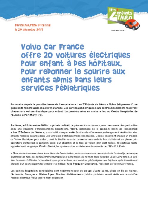 Grâce à Volvo Car France, partenaire de la première heure de l'association Les Z'Enfants de l'Auto, les services pédiatriques de 20 centres hospitaliers recevront cette année une voiture électrique qui permettra aux enfants hospitalisés et en phase pré-opératoire d'effectuer le parcours entre leur chambre et le bloc opératoire au volant d'un petit bolide.