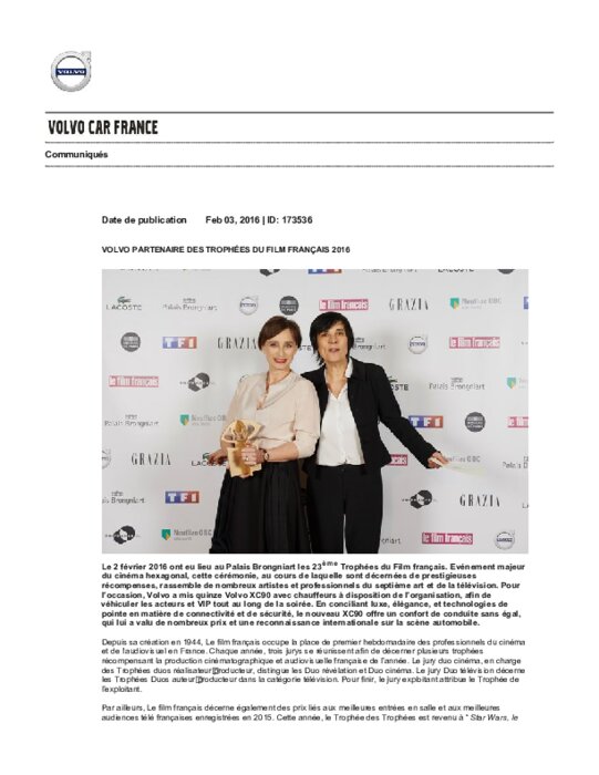 Le 2 février 2016 ont eu lieu au Palais Brongniart les 23ème Trophées du Film français. Evénement majeur du cinéma hexagonal, cette cérémonie, au cours de laquelle sont décernées de prestigieuses récompenses, rassemble de nombreux artistes et professionnels du septième art et de la télévision. Pour l’occasion, Volvo a mis quinze Volvo XC90 avec chauffeurs à disposition de l’organisation, afin de véhiculer les acteurs et VIP tout au long de la soirée.