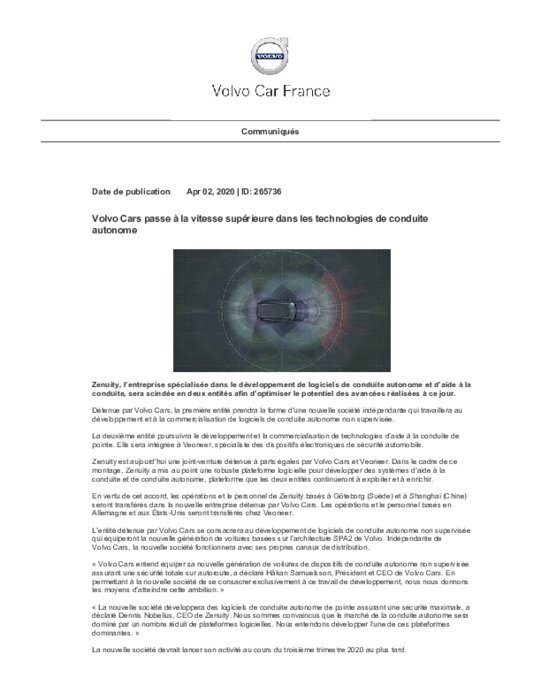 Constructeurs 02 avril 2020 - 17:52 Zenuity, l’entreprise spécialisée dans le développement de logiciels de conduite autonome et d’aide à la conduite, sera scindée en deux entités afin d’optimiser le potentiel des avancées réalisées à ce jour. PDF (126 Ko) Télécharger