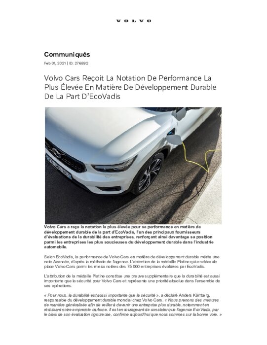 Volvo Cars a reçu la notation la plus élevée pour sa performance en matière de développement durable de la part d’EcoVadis, l’un des principaux fournisseurs d’évaluations de la durabilité des entreprises, renforçant ainsi davantage sa position parmi les entreprises les plus soucieuses du développement durable dans l’industrie automobile.