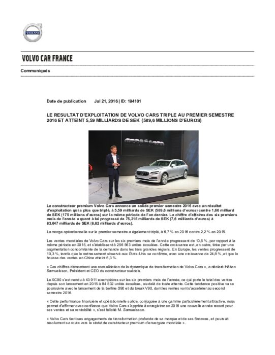 Cédé en 2011 à Geely par l'américain Ford, Volvo Cars possède des usines en Suède, en Belgique et en Chine. Il a dégagé en 2015 un bénéfice net multiplié par près de neuf par rapport à 2014, à 4,48 milliards de couronnes.