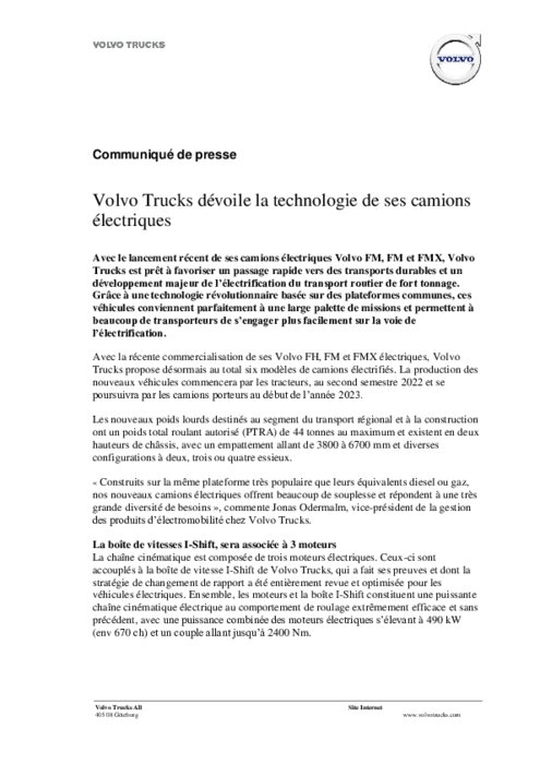Avec le lancement récent de ses camions électriques Volvo FM, FM et FMX, Volvo Trucks est prêt à favoriser un passage rapide vers des transports durables et un développement majeur de l’électrification du transport routier de fort tonnage. Grâce à une technologie révolutionnaire basée sur des plateformes communes, ces véhicules conviennent parfaitement à une large palette de missions et permettent à beaucoup de transporteurs de s’engager plus facilement sur la voie de l’électrification.
