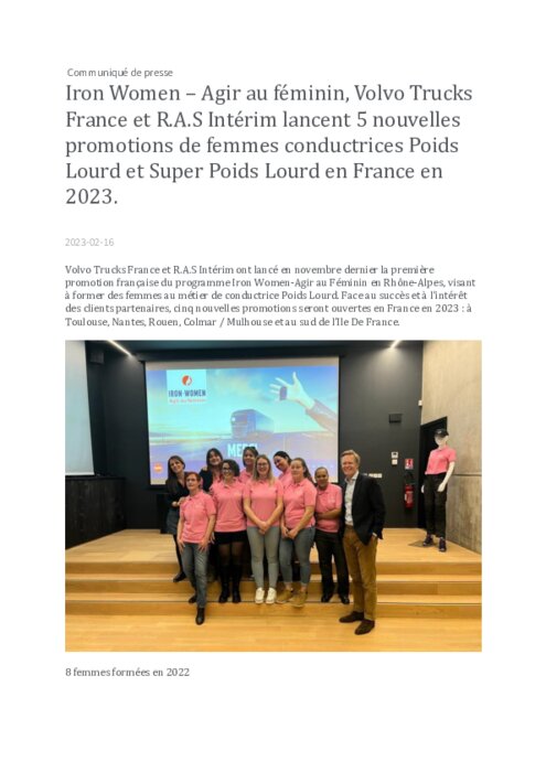 Volvo Trucks France et R.A.S Intérim ont lancé en novembre dernier la première promotion française du programme Iron Women-Agir au Féminin en Rhône-Alpes, visant à former des femmes au métier de conductrice Poids Lourd. Face au succès et à l’intérêt des clients partenaires, cinq nouvelles promotions seront ouvertes en France en 2023 : à Toulouse, Nantes, Rouen, Colmar / Mulhouse et au sud de l’Ile De France.
