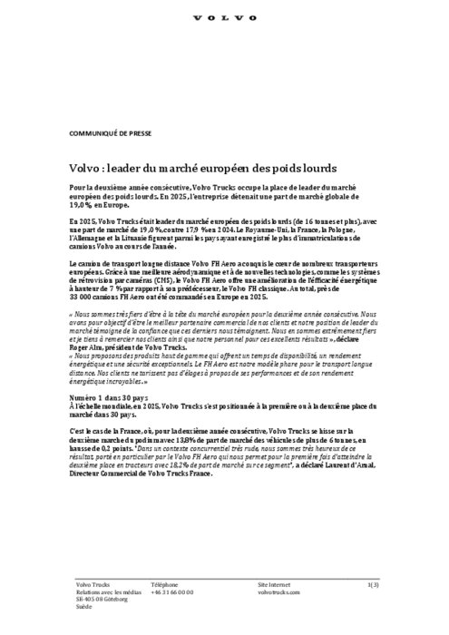 En France, pour la deuxième année consécutive, Volvo Trucks se hisse sur la deuxième marche du podium avec 13,8% de part de marché des véhicules de plus de 6 tonnes, en hausse de 0,2 points. "Dans un contexte concurrentiel très rude, nous sommes très heureux de ce résultat, porté en particulier par le Volvo FH Aero qui nous permet pour la première fois d'atteindre la deuxième place en tracteurs avec 18,2% de part de marché sur ce segment", a déclaré Laurent d'Arnal, Directeur Commercial de Volvo Trucks France.