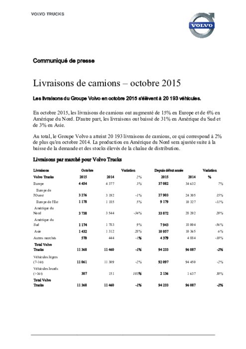 Constructeurs 30 novembre 2015 - 18:04 Au total, le Groupe Volvo a atteint 20 193 livraisons de camions, ce qui correspond à 2% de plus qu'en octobre 2014. La production en Amérique du Nord sera ajustée suite à la baisse de la demande et des stocks élevés de la chaîne de distribution. PDF (198 Ko) Télécharger