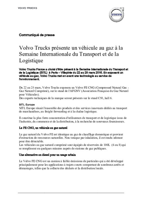 Volvo Trucks a choisi d’être présent à la Semaine Internationale du Transport et de la Logistique (SITL) à Paris – Villepinte du 22 au 25 mars 2016. En exposant un véhicule au gaz, Volvo Trucks met en avant une technologie au service de l’environnement.