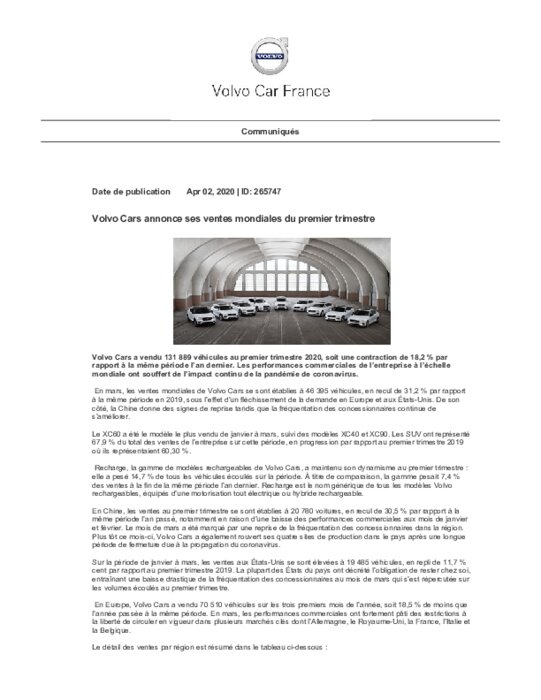 Volvo Cars a vendu 131 889 véhicules au premier trimestre 2020, soit une contraction de 18,2 % par rapport à la même période l’an dernier. Les performances commerciales de l’entreprise à l’échelle mondiale ont souffert de l’impact continu de la pandémie de coronavirus.