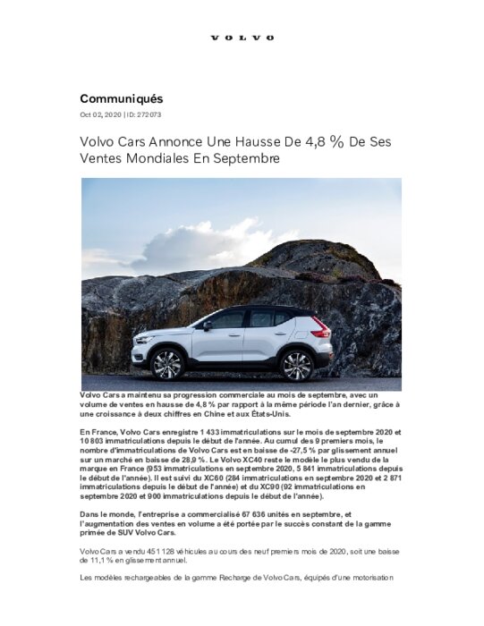 Volvo Cars a maintenu sa progression commerciale au mois de septembre, avec un volume de ventes en hausse de 4,8 % par rapport à la même période l’an dernier, grâce à une croissance à deux chiffres en Chine et aux États-Unis. En France, Volvo Cars enregistre 1 433 immatriculations sur le mois de septembre 2020 et 10 803 immatriculations depuis le début de l'année...