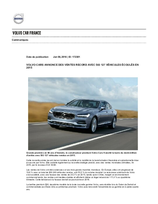 Grande première en 89 ans d’histoire, le constructeur premium Volvo Cars franchit la barre du demi-million d’unités avec 503 127 véhicules vendus en 2015. Cette nouvelle année record met en lumière la solidité et la viabilité de la transformation financière et opérationnelle mise en œuvre par Volvo. Elle conforte également sa nouvelle stratégie produit, avec des ventes mondiales stimulées, fin 2015, par le nouveau SUV XC90.