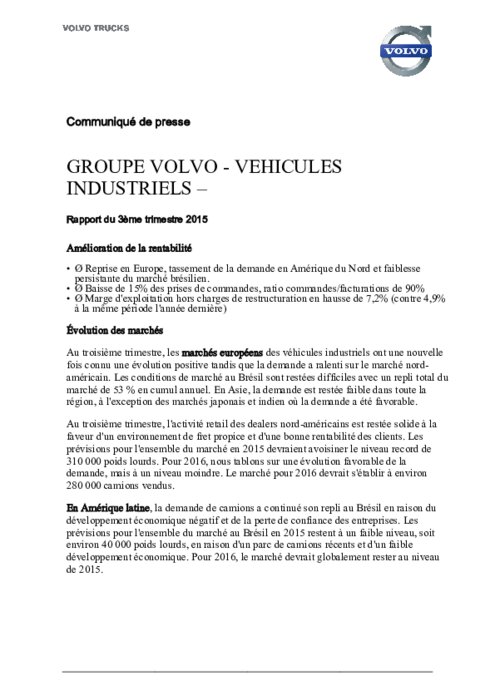 Au troisième trimestre, les marchés européens des véhicules industriels ont une nouvelle fois connu une évolution positive tandis que la demande a ralenti sur le marché nord-américain. Les conditions de marché au Brésil sont restées difficiles avec un repli total du marché de 53 % en cumul annuel. En Asie, la demande est restée faible dans toute la région, à l'exception des marchés japonais et indien où la demande a été favorable.