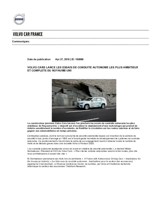 Volvo est membre, avec son concurrent Ford, le géant d'internet Google, et les services de réservation de voiture avec chauffeur Uber et Lyft, d'un lobby né mardi pour promouvoir auprès des législateurs et du grand public la cause des voitures pilotées par un ordinateur.