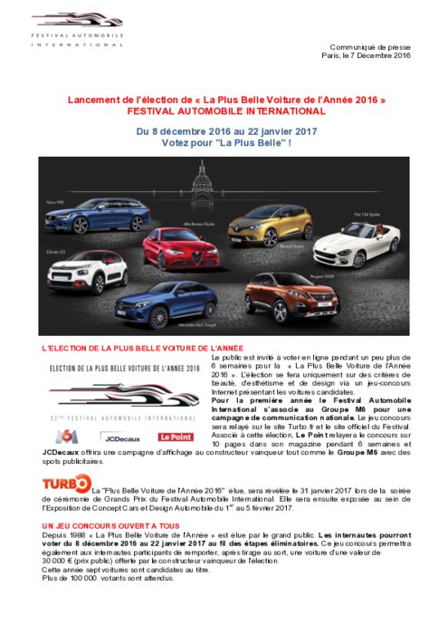 Le public est invité à voter en ligne pendant un peu plus de 6 semaines pour la « La Plus Belle Voiture de l'Année 2016 ». L'élection se fera uniquement sur des critères de beauté, d'esthétisme et de design via un jeu-concours Internet présentant les voitures candidates. Pour la première année le Festival Automobile International s’associe au Groupe M6 pour une campagne de communication nationale. Le jeu concours sera relayé sur le site Turbo.fr et le site officiel du Festival.