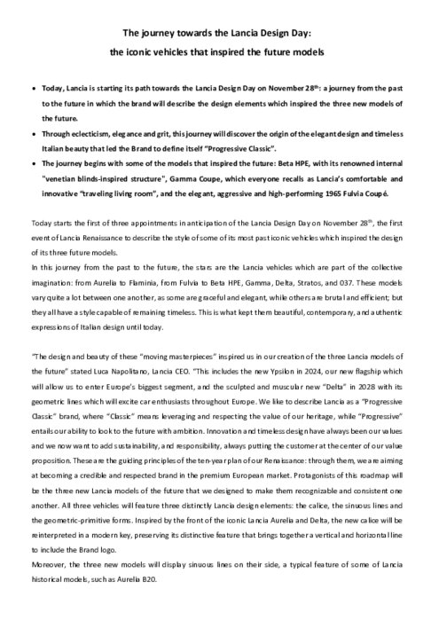 Le premier rendez-vous vers le « Lancia Design Day » le 28 novembre débute aujourd'hui, premier événement de la Renaissance de Lancia. Lancia a organisé ce rendez-vous pour mettre en valeur le design de certaines de ses icônes les plus célèbres qui ont inspiré trois de ses futurs modèles. Aujourd'hui, la Lancia Beta HPE et la Lancia Gamma Coupé.